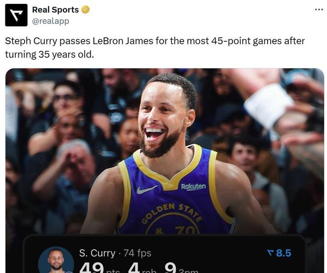 同时本场是库里30岁后第7场轰下45+得分,超过詹姆斯的6次,独占NBA历史第一。